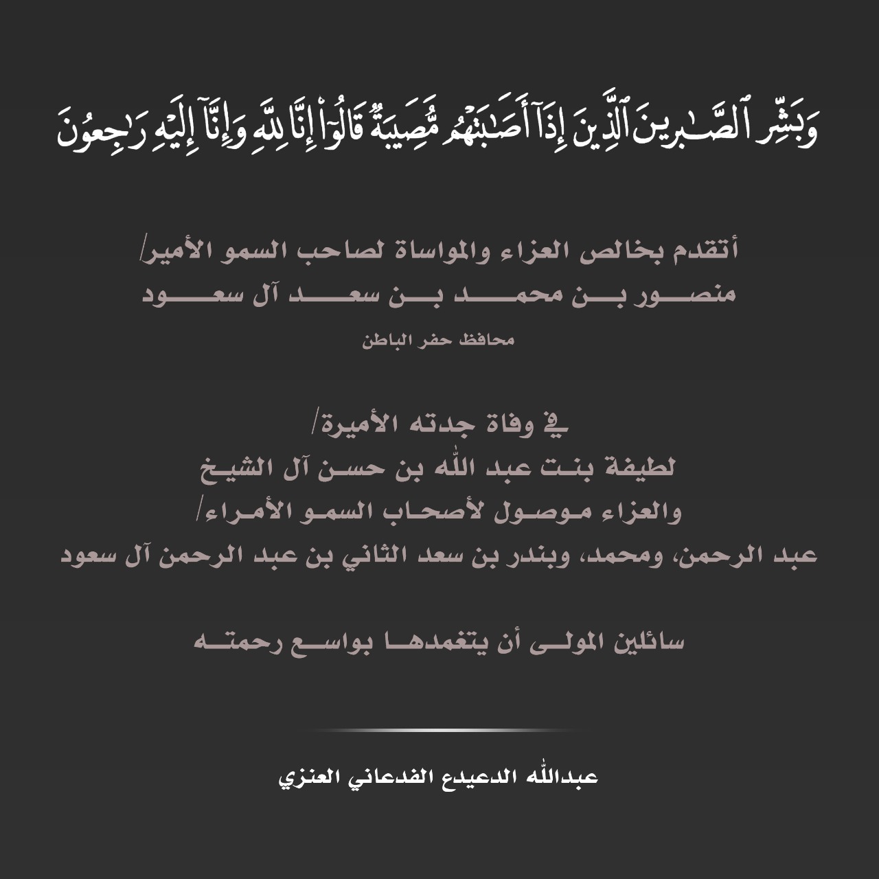 الساحات On Twitter يتقدم عبدالله الدعيدع العنزي بخالص العزاء والمواساة لمحافظ حفرالباطن الأمير منصور بن محمد في وفاة جدته الأميرة لطيفة بنت عبدالله آل الشيخ سائلا المولى عز وجل أن يتغمد الفقيدة