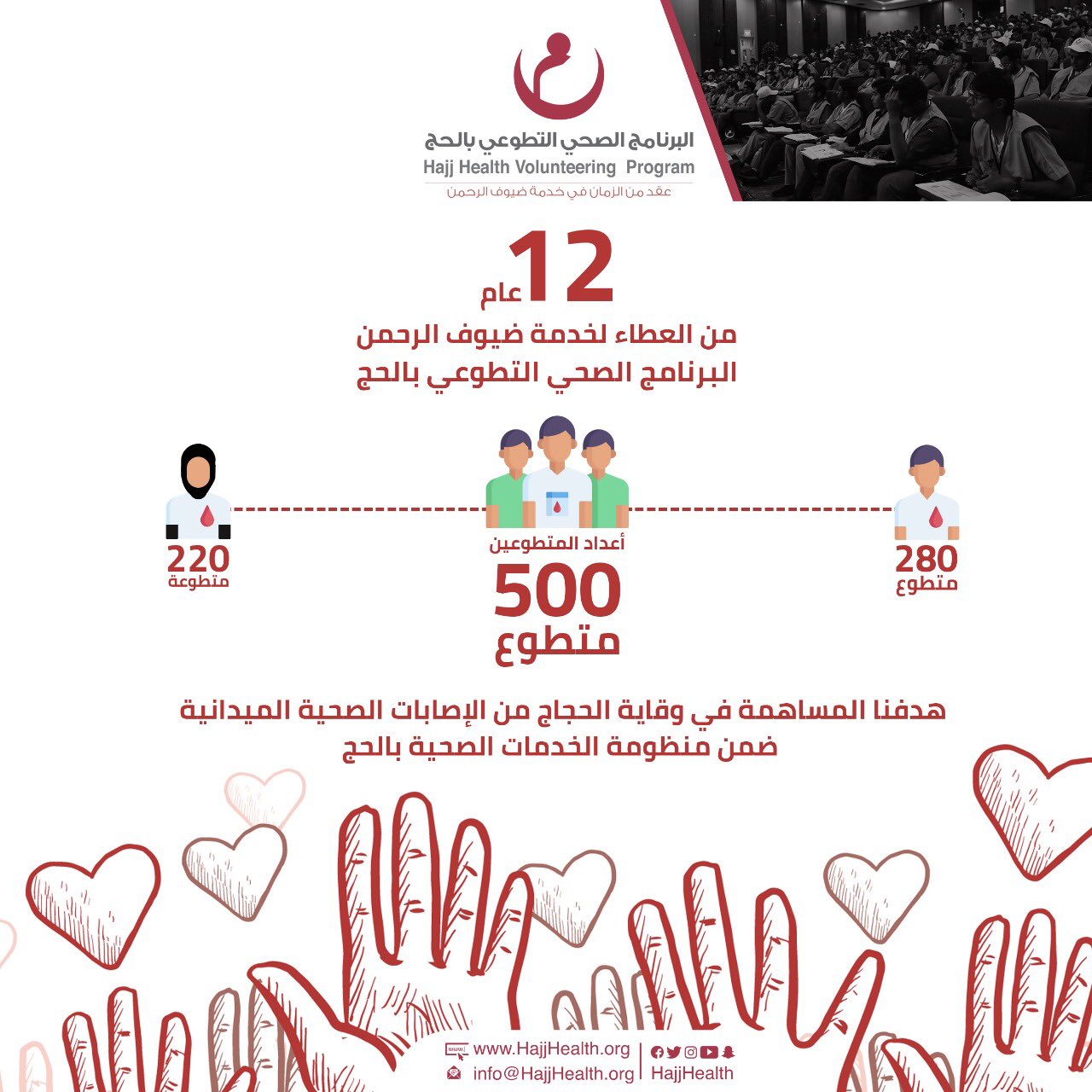 البرنامج الصحي التطوعي بالحج يعلن عن موعد إطلاق رابط التسجيل للموسم الثالث عشر. البرنامج الصحى التطوعى بالحج p برنامج سنوي تنفذه اللجنة الطبية بالندوة العالمية للشباب الإسلامي و عبر التنسيق مع المديرية العامة للدفاع المدني الشريك الميداني.