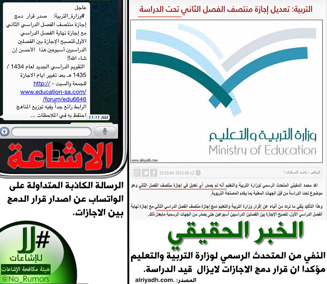 هيئة مكافحة الإشاعات على تويتر المتحدث الرسمي لوزارة التربية ينفي اصدار قرار دمج اجازة منتصف الفصل الدراسي الثاني مؤكدا ان القرار لايزال قيد الدراسة Http T Co Uyordrqftw