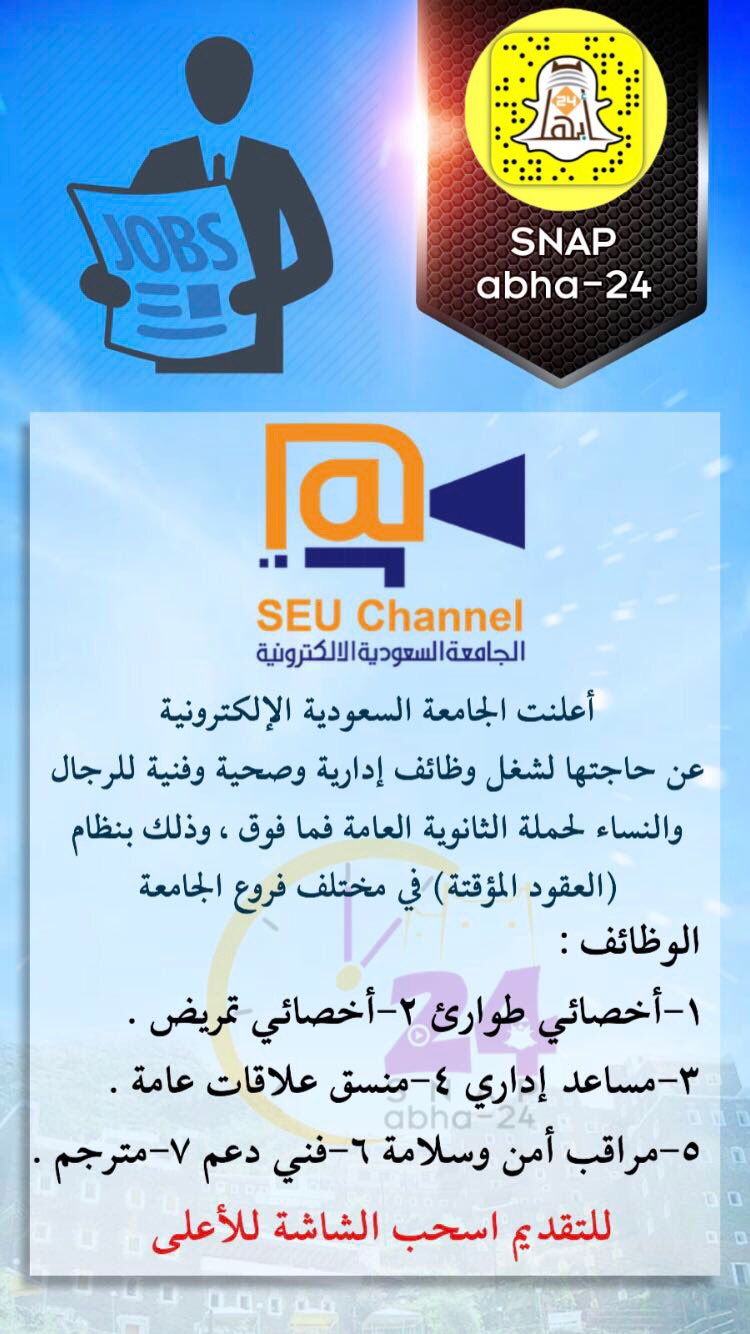 تعلن عمادة شؤون أعضاء هيئة التدريس. تعلن الجامعة السعودية الإلكترونية عن حاجتها لشغل 33 وظيفة إدارية وصحية وفنية للرجال والنساء بنظام العقود المؤقتة في مختلف فروع الجامعة وذلك واشترطت أن يكون المتقدم أو المتقدمة سعودي الجنسية حاصل على ترخيص من.