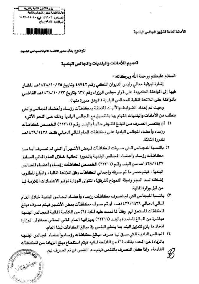 اللائحة المالية للمجالس البلدية 1438. إبحث عن وزارة الشؤون البلدية والقروية. اللائحة المالية للمجالس البلدية. قرر مجلس الوزراء الموافقة على اللائحة المالية للمجالس البلدية بعد الاطلاع على ما رفعه معالي وزير الشؤون البلدية والقروية وبعد الاطلاع على التوصية المعدة في مجلس الشؤون الاقتصادية والتنمية رقم 30 53 38 د وتاريخ 19 8. صدرت الموافقة الكريمة بإقرار اللائحة المالية للمجالس البلدية وأعدت على ضوئها الأمانة العامة للمجالس البلدية الضوابط والآليات المتعلقة بمكافآت رؤساء وأعضاء المجالس البلدية.