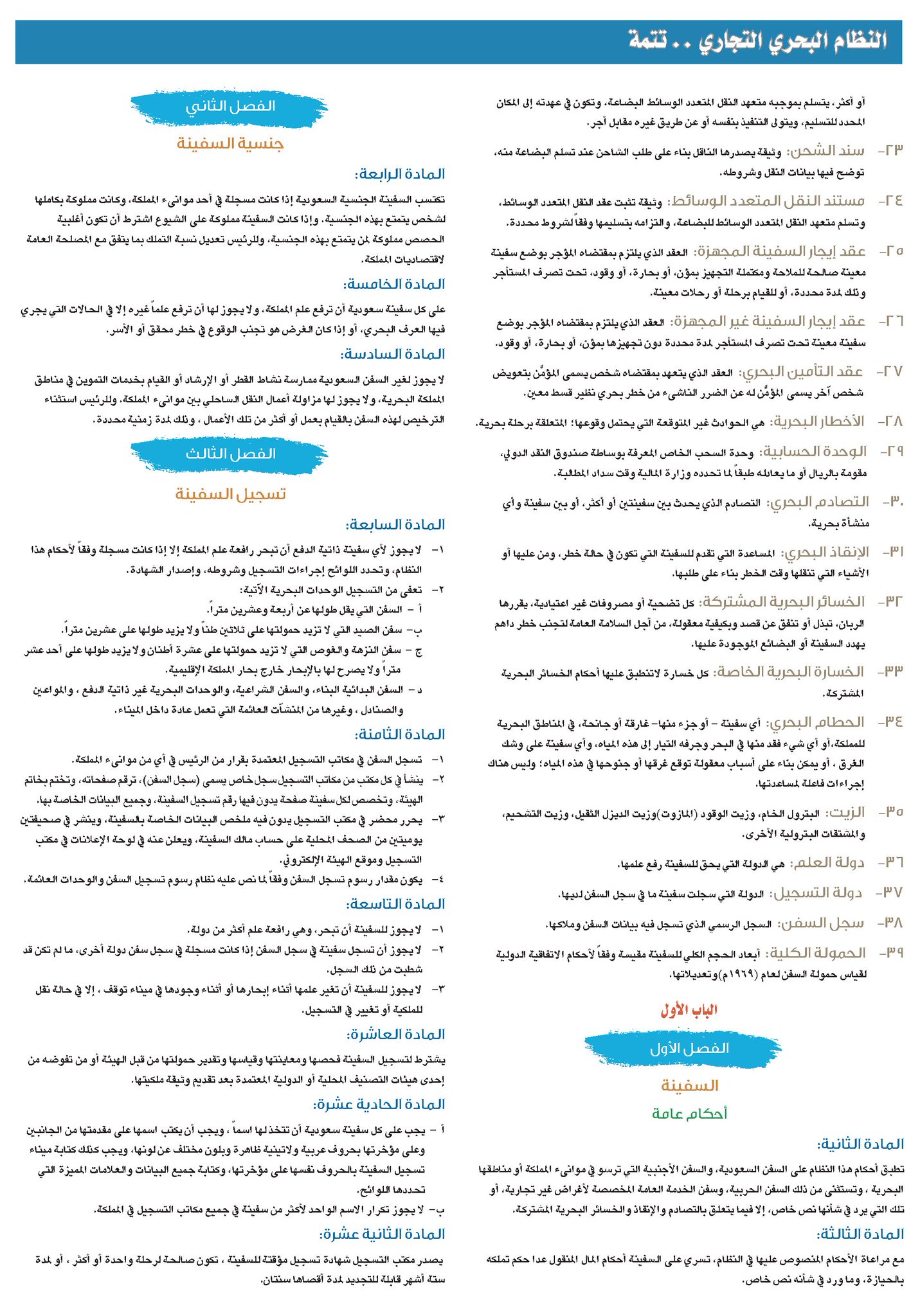 أو استخدم الانتقال السريع. تتجلى أهمية صدور هذا النظام بالنظر للوضع السابق فقد كان النظام البحري التجاري في المملكة مندرجا في الباب الثاني من نظام المحكمة التجارية الصادر عام 1350هـ وهو الباب المتعلق. جميع الحقوق محفوظة 1442 2020 القائمة البريدية اشترك معنا في القائمة البريدية ليصلك جديدنا. وتطبق أحكام هذا النظام.