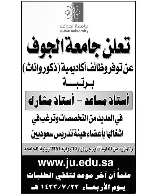 سكاكا الجوف ص. تعلن جامعة الجوف عن توفر وظائف أكاديمية بدرجة أستاذ أستاذ مشارك أستاذ مساعد للسعوديين والسعوديات في مقرات الجامعة بسكاكا والقريات وطبرجل خلال الفترة 19 3 1440هـ 29 3 1440هـ وذلك حسب الش. أعلنت جامعة الجوف عن توفر وظائف أكاديمية شاغرة بالمسميات. وأوضحت في بيان لها أن التقديم سيكون متاح اعتبارا من من تاريخ 15.