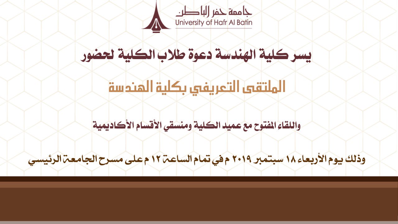 جامعة حفر الباطن V Twitter يسر كلية الهندسة في جامعة حفر الباطن دعوة طلاب الكلية لحضور الملتقى التعريفي بكلية الهندسة واللقاء المفتوح مع عميد الكلية ومنسقي الأقسام الأكاديمية وذلك يوم الأربعاء في تمام الساعة