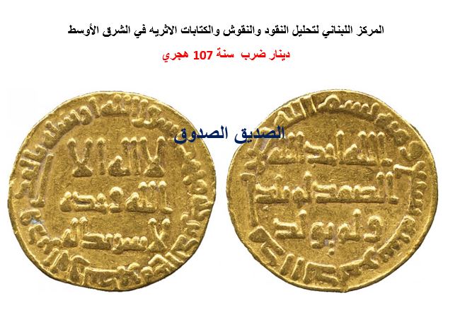 المركز اللبناني لتحليل النقود والنقوش والكتابات الاثريه في الشرق الاوسط دينار اموي لهشام بن عبد الملك سنة 107 هجري Hisham Bin Abd Al Malik 105 125h Gold Dinar 107h