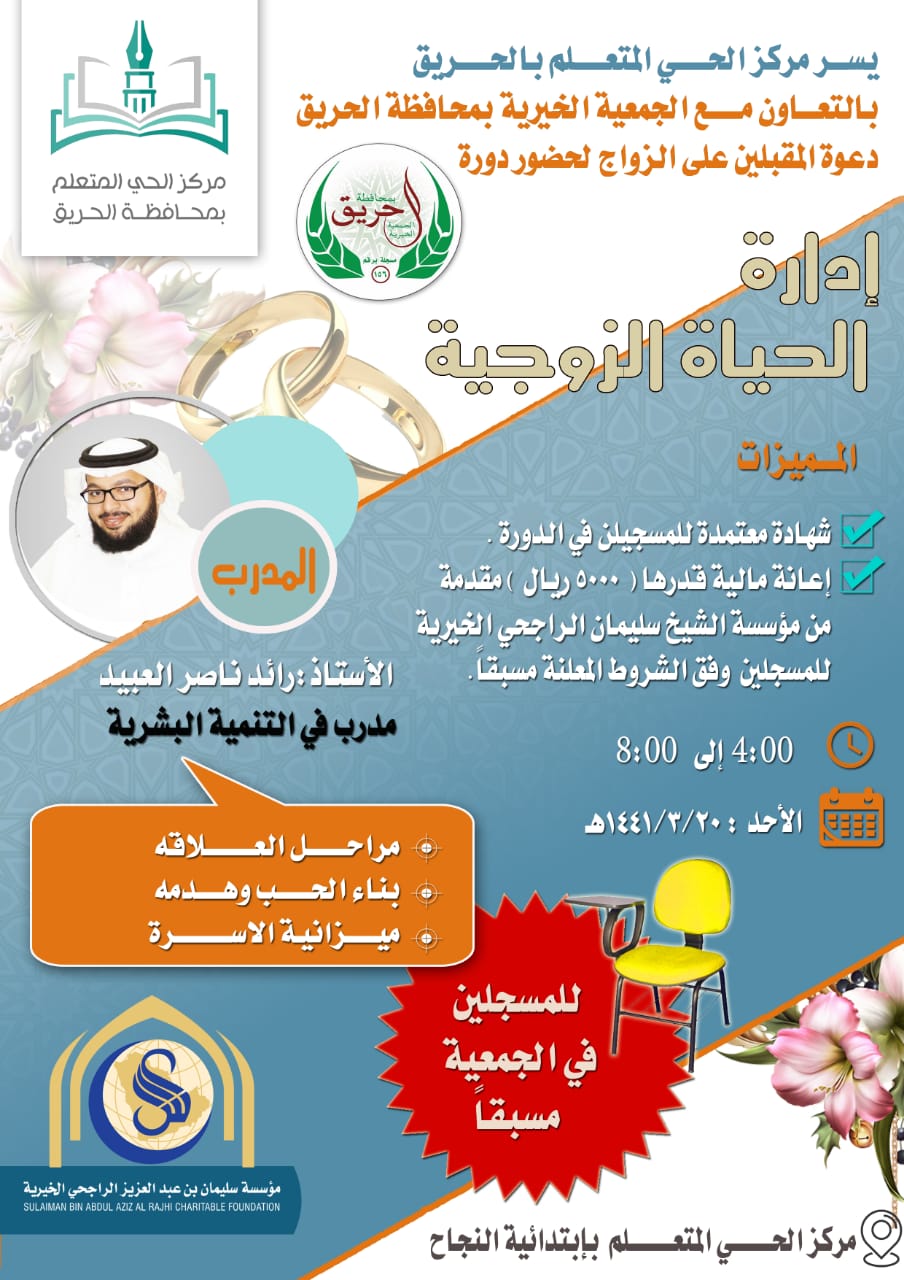 صحيفة محافظة الحريق V Twitter مركز الحي المتعلم بالتعاون مع الجمعية الخيرية بالحريق يعلن عن دعوة المقبلين على الزواج لحضور دورة إدارة الحياة الزوجية يقدمها الاستاذ رائد العبيد شهادة معتمدة للمسجلين في الدورة مع