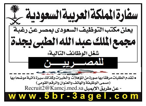 اعلان سفارة السعودية للمصريين بمجمع الملك عبدالله الطبى بجدة والتقديم الكترونى