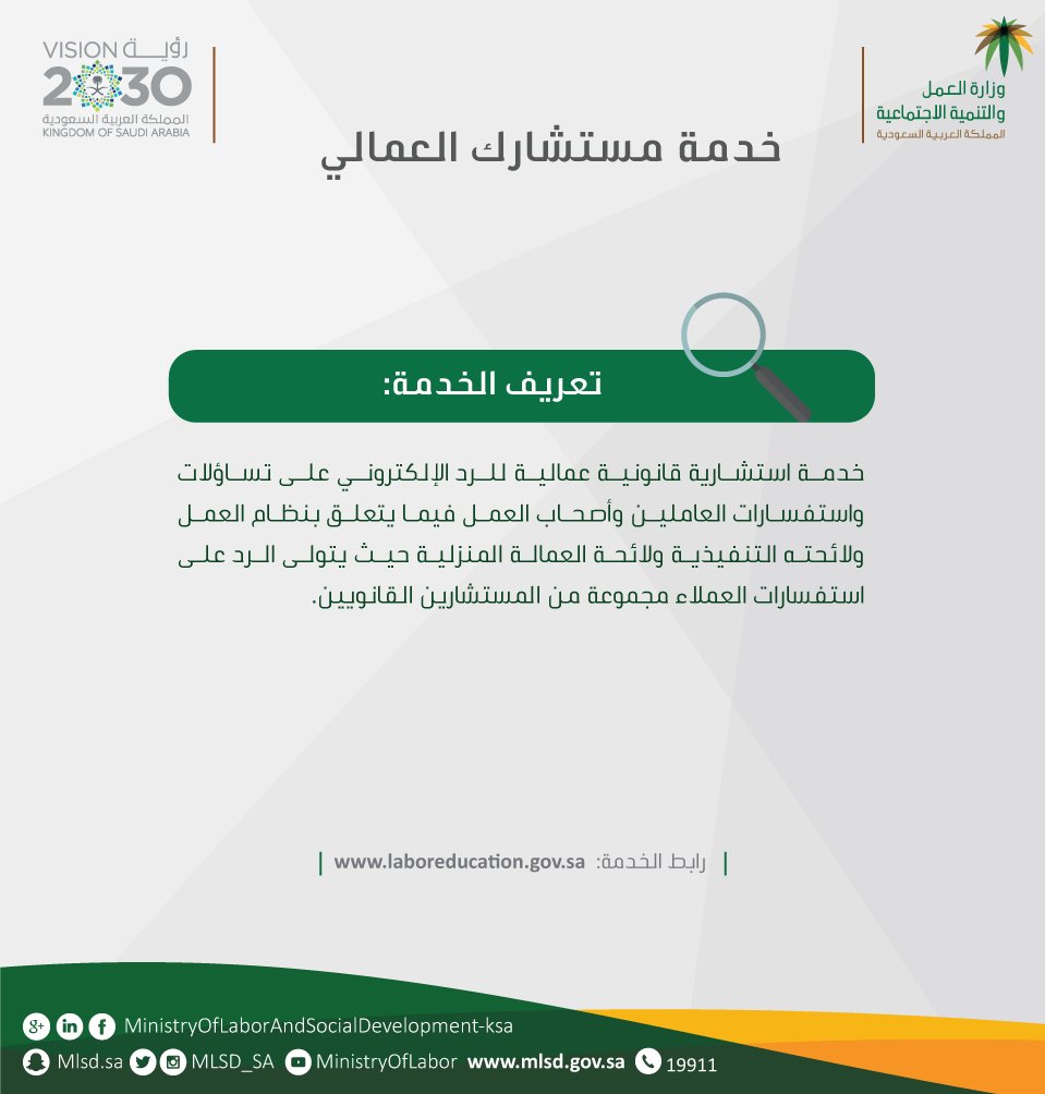 مستشارك العمالى نقدم لكم اليوم من خلال موقع الفرعون طريقه التسيجيل فى مستشارك العمالى حيث تعتبر وزاره العمل و التنميه الاجتماعيه فى المملكه العربيه السعوديه من اهم الوزارات داخل المملكه حيت ان هذه الوزاره الحيويه. خدمة عملاء مستشارك العمالي بوزارة العمل خدمة مستشارك العمالي هي عبارة عن خدمة يتم من خلالها تقديم ما يبحث عنه العمال خلال أكثر من طريقة حيث تتوفر من خلال مكاتب العمل الموجودة في السعودية ايض ا عن طريق حساب خدمة. إن كان لديكم شكاوى خاصة بكم أو بعملكم يمكنكم تقديمها التفاصيل رابط الخدمة. تم تقديم خدمة مستشارك العمالي للعملاء بالوزارة والذين يتمثلوا في الأشخاص والمواطنين الذين يقوموا بالبحث عن العمل وأصحاب العمل والعمال الموظفين بالفعل لقد حرصت الوزارة على تقديم تلك.