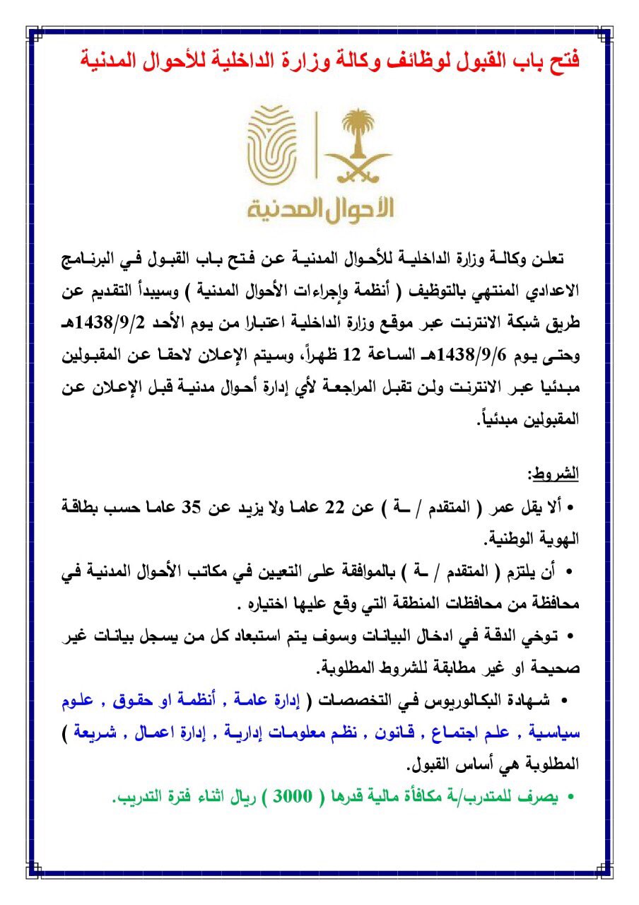 أعلنت وزارة الداخلية في السعودية عن برنامج تدريب منتهي بالتوظيف بالأحوال. وظائف الأحوال المدنية 1438 على البرنامج الإعدادي المنتهي بالتوظيف للرجال والنساء عبر وزارة الداخلية وإيضاح شروط القبول ورابط التقديم الرسمي. وظائف الاحوال المدنيه نساء ١٤٣٨ اسماء المقبولين في الاحوال المدنية 1438. يبدأ التقديم علي ابشر توظيف يوم الأحد الموافق 1440 10 13هـ الساعة 10 00 صباحا وينتهي يوم الأربعاء بتاريخ 1440 10 16هـ الساعة 10 00 صباحا إن شاء الله وفيما يلي.
